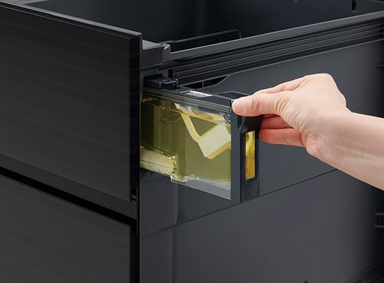 3. 上質なキッチン空間に溶け込むダーク系タンクカラーを採用。ノイズレスなデザインを実現。