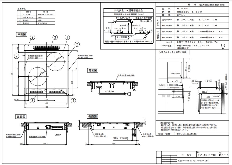 IHクッキングヒーター 日立製(HITACHI)HT-40C ブラック HT40Cシリーズ 間口45cm 2口IHヒーター